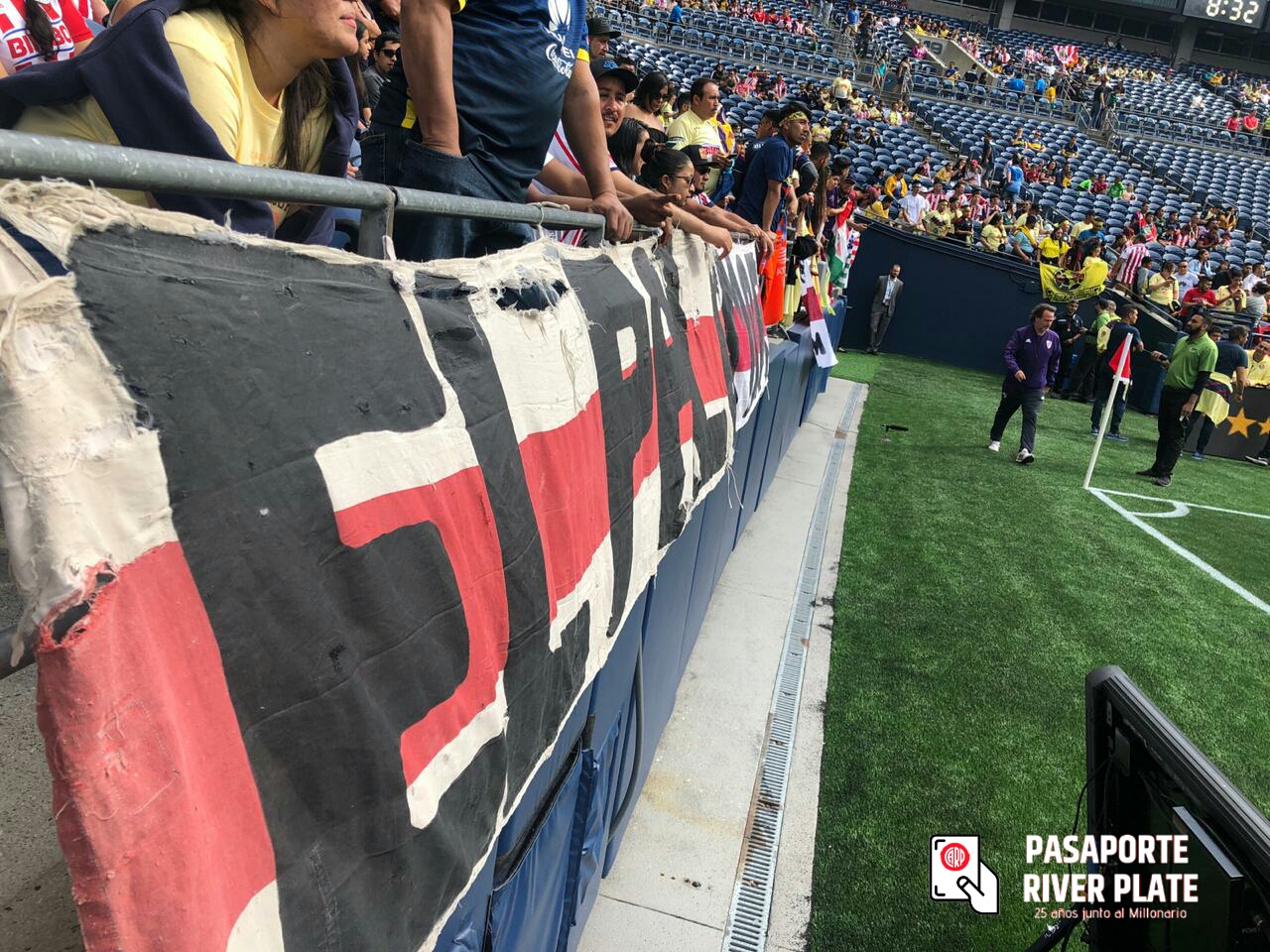 Debido a la actualidad del país, pocos hinchas pudieron viajar, pero como pasa siempre River nunca esta solo. Siempre hay alguna bandera, alguienn que llega hasta el estadio para acompañar. En este caso fueron las banderas de El Palomar, Ezeiza, Tio Norman, River Tour, Goya y Filial Los Angeles. Pocos, pero fieles, el amor no sabe de gasatos.