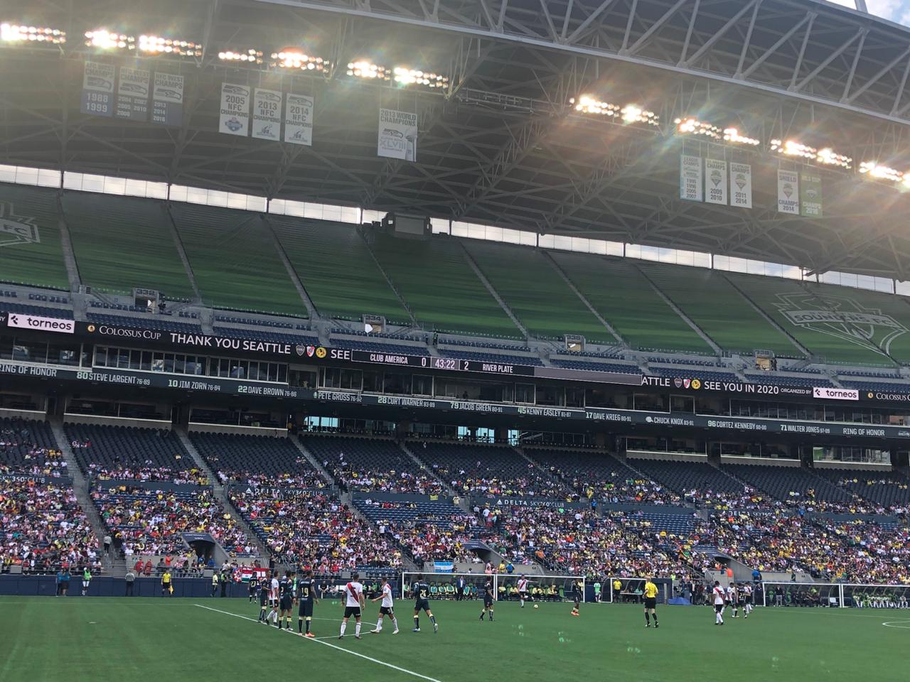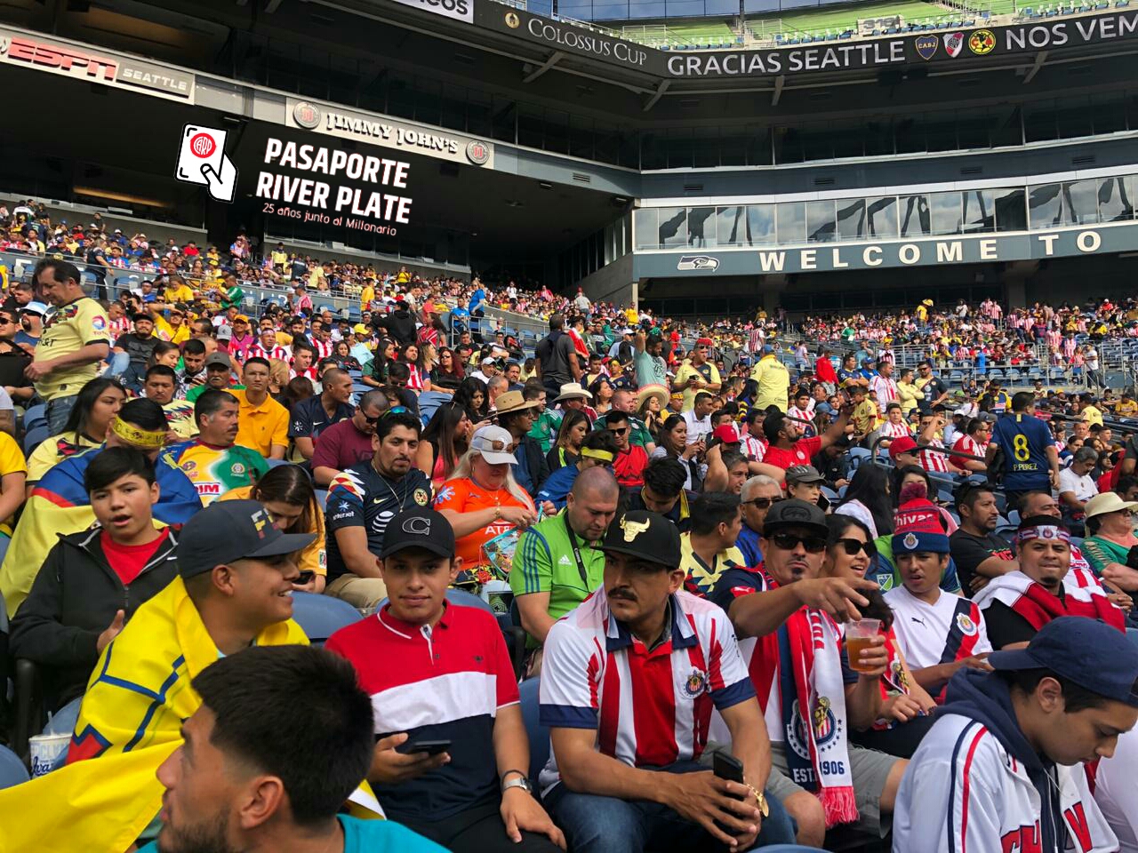 Arribamos a Seattle con los minutos contados,  y fuimos directamente al Centuryfield Link de Seattle, donde desde horas tempranas se junto la parcialidad Mexicana. No solo del Ámerica, sino de Chivas de Guadalajara compartían tranquilamente el mismo espacio. La organización nos acredito para Cabina, pero la sangre nos tira y fuimos a la tribuna a compartir el partido con los hinchas millonarios.